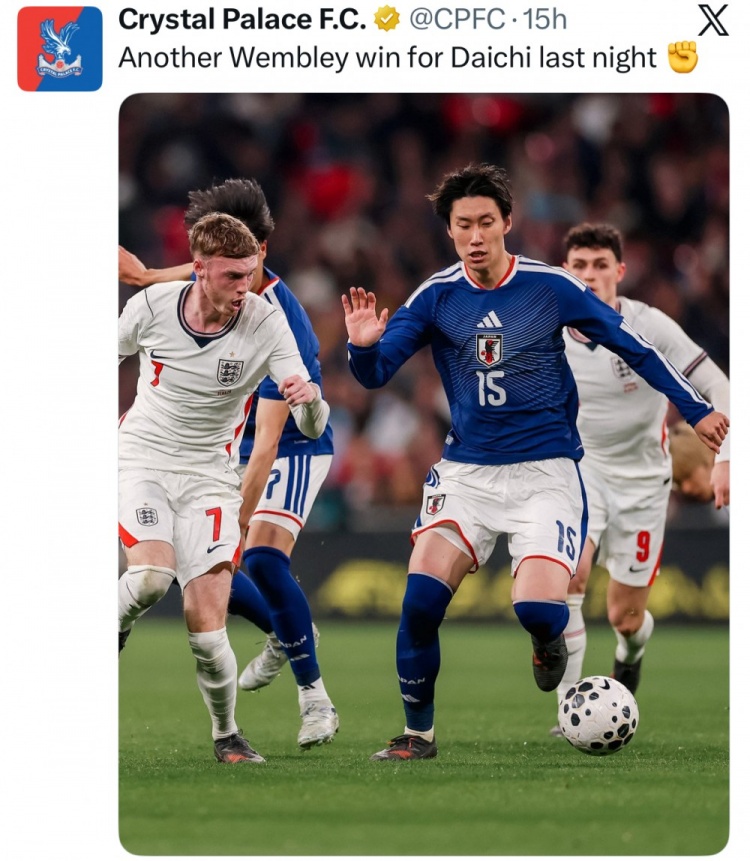 水晶宫官推也晒出镰田大地的比赛照,并配文写道:“昨晚大地再一次在温布利取得比赛胜利!”